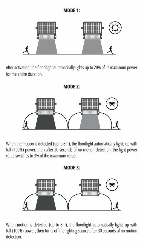 ✔ Elke bedrijfsmodus is geprogrammeerd zodat de Solar schijnwerper ENKEL na zonsondergang inschakelt en bij zonsopgang uitschakelt