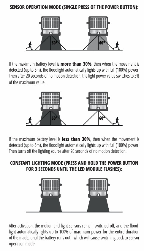 ✔ Elke bedrijfsmodus is geprogrammeerd zodat de Solar schijnwerper ENKEL na zonsondergang inschakelt en bij zonsopgang uitschakelt