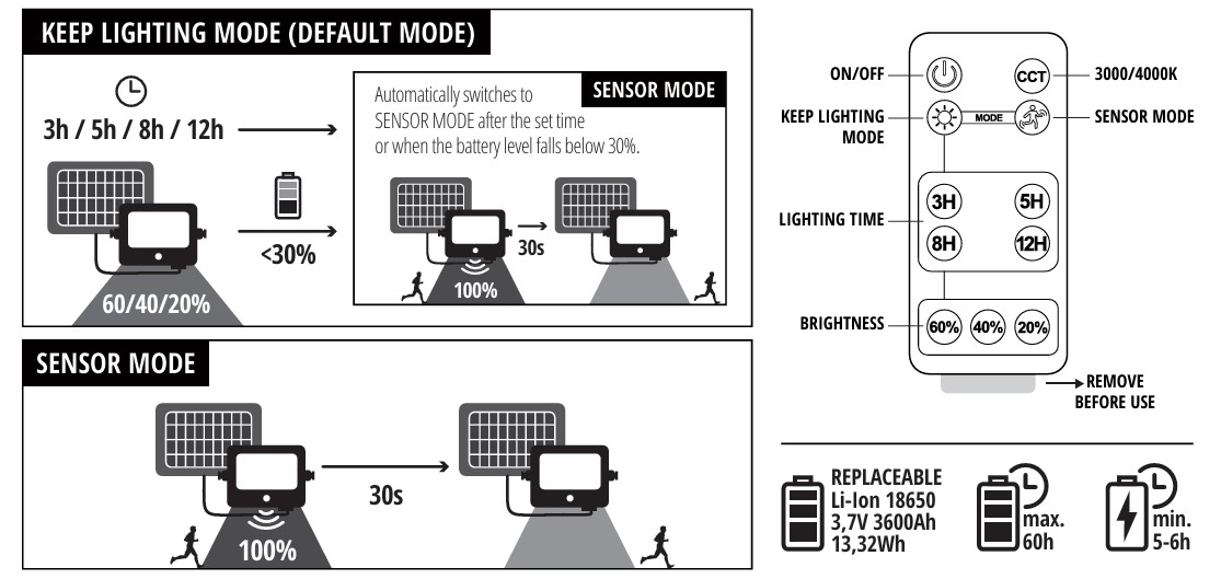 ✔ Twee bedrijfsmodi: – bewegings- en schemersensormodus – continue verlichtingsmodus (instellingen configureerbaar via afstandsbediening)